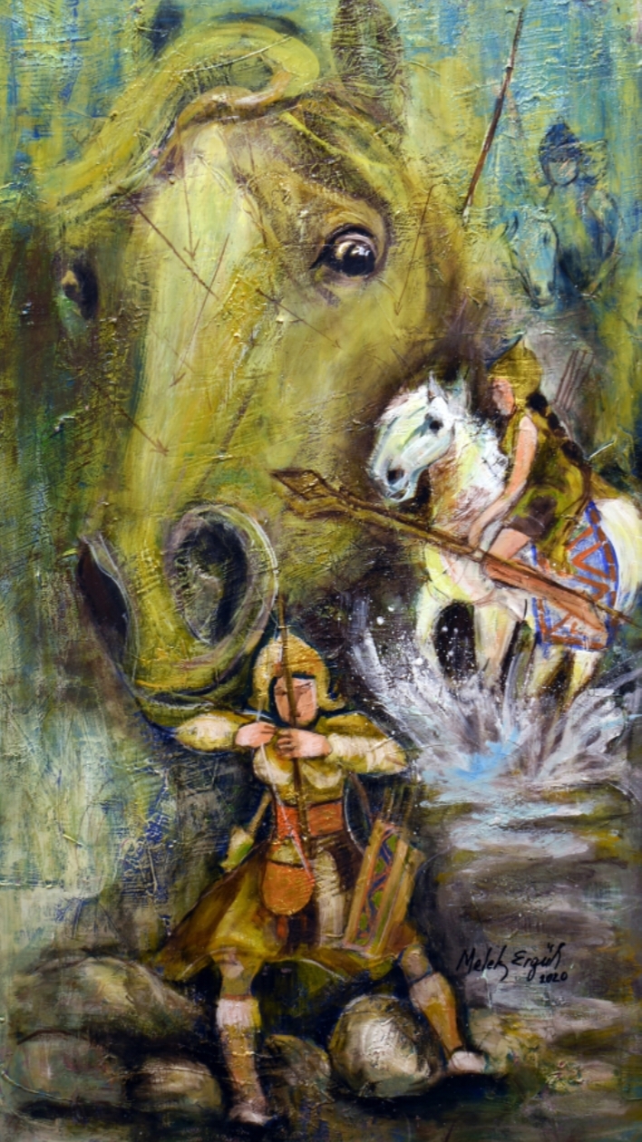 “Amazon Kadınlar tuvale at, kalkan, ok ve miğfer olmadan aktarılamaz” diyen Ergül, Amazon Kadınların özünde Anadolu Kadını olduğu gerçeğine dikkat ettiğini söyledi.