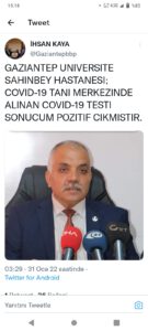 Haberi Twitter hesabı üzerinden duyuran Büyük Birlik Partisi Gaziantep İl Başkanı İhsan Kaya “Gaziantep Üniversitesi Şahinbey Hastanesi Covid 19 Tanı Merkezinde alınan covit 19 testim pozitif çıkmıştır” şeklinde açıklamada bulunarak haberi duyurdu.