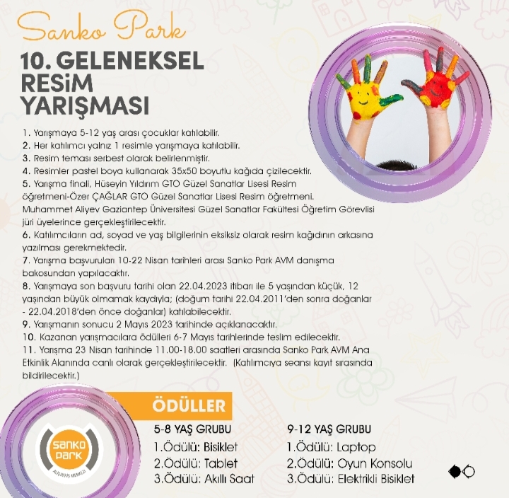 Gaziantep’in yaşam alanı Sanko Park Alışveriş Merkezi, 23 Nisan Ulusal Egemenlik ve Çocuk Bayramı’na özel ödüllü resim yarışması düzenliyor.