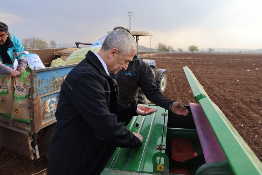 Şahinbey Belediye Başkanı Mehmet Tahmazoğlu, çiftçilerin desteklenmesi için dağıttığı buğday tohumunu ve gübreyi çiftçilerle birlikte toprakla buluşturdu.