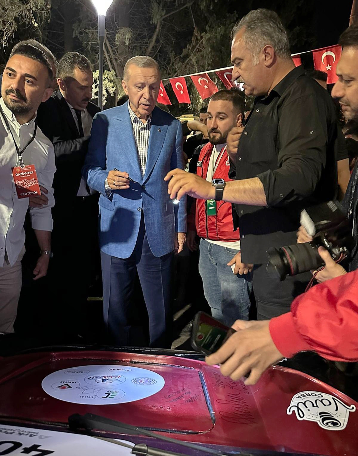28 Mayıs seçim çalışmaları kapsamında Gaziantep’e gelen Cumhurbaşkanı Recep Tayyip Erdoğan, TEKNOFEST Uluslararası Effıcıency Challenge Elektrikli Araç Yarışında 2’nci olan Zeugma-Hilal aracını inceleyerek imzaladı.