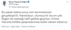 Erdoğan’ın sosyal medya hesabından yaptığı paylaşımda, “Bugün hafif belirtiler üzerine eşimle birlikte yaptırdığımız COVID-19 testimizin sonucu pozitif çıktı. Omicron varyantı olduğunu öğrendiğimiz hastalığı hamdolsun hafif geçiriyoruz. Görevimizin başındayız. Çalışmalarımıza evde devam edeceğiz. Dualarınızı bekliyoruz.” ifadelerini kullanmıştı.