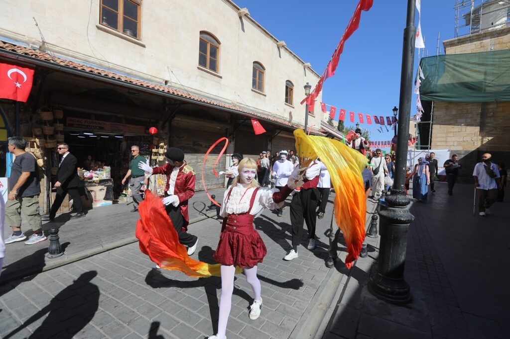Gaziantep Kalesi’nde toplanan kalabalık, Büyükşehir Belediyesi Bandosu’nun çaldığı şarkılar eşliğinde şehrin tarihi noktalarından olan Bakırcılar Çarşısı ve Almacı Pazarı’ndan geçerek Balıklı Meydanı’na geldi.