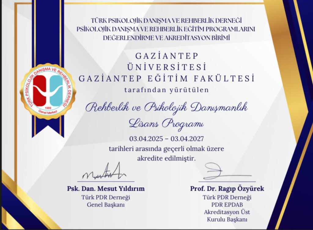 Gaziantep Üniversitesi (GAÜN) Eğitim Fakültesi, önemli bir başarıya imza attı. Fakülte bünyesinde yürütülen Rehberlik ve Psikolojik Danışmanlık (PDR) Lisans Programı, Türk Psikolojik Danışma ve Rehberlik Derneği (Türk PDR Derneği) tarafından akredite edilerek kalitesini resmen tescilledi.