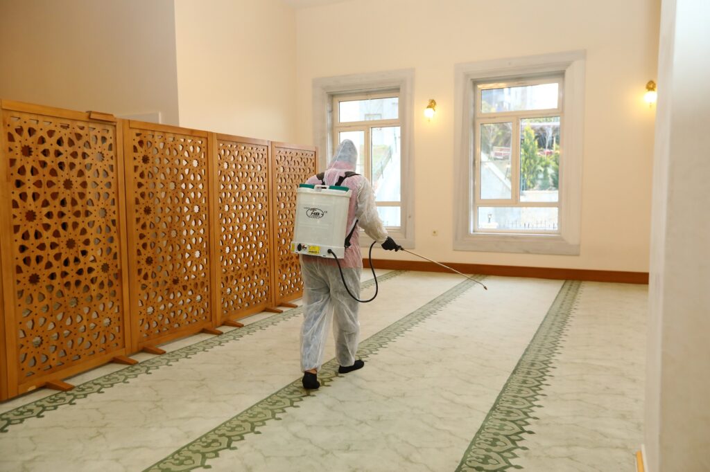 amacıyla yürütülen çalışmalar kapsamında camiler detaylı şekilde temizleniyor, dezenfekte
