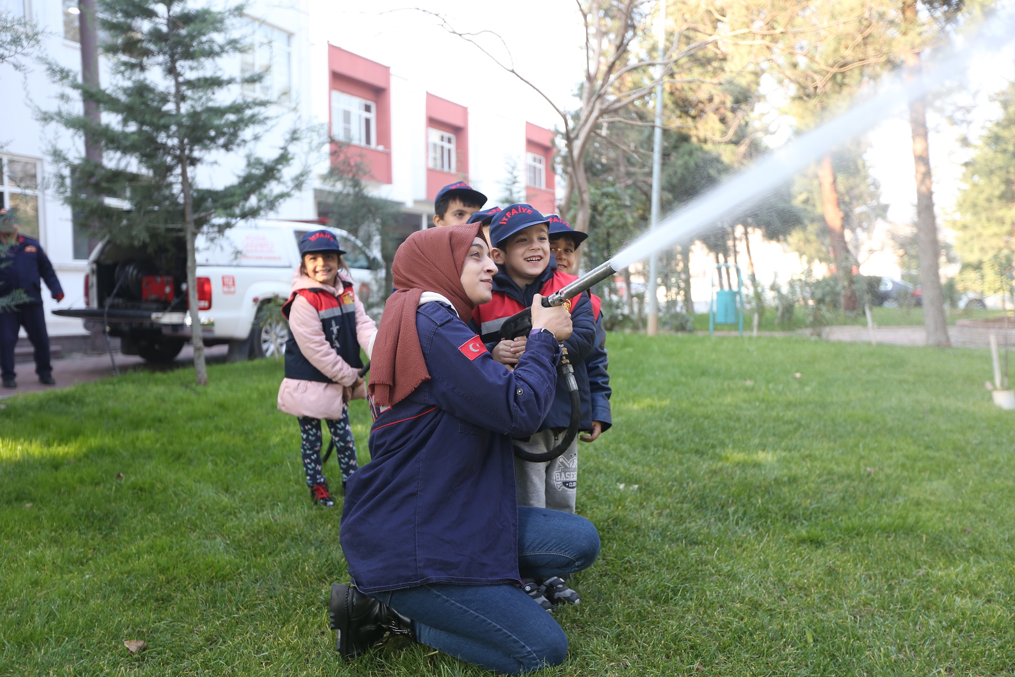 Merkez itfaiye binasına gelen Emrullah Şule Anaokulu öğrencileri, yelek ve şapkalarını giydi, hayallerindeki mesleklerden olan itfaiyecileri karşılarında görünce merak ettiği soruları sordu. Yaklaşık 30 dakika süren eğitimin sonunda minikler itfaiye personelleriyle beraber su sıkarak tecrübe yaşadılar.