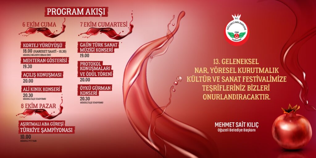 Festival hakkında bilgi veren Oğuzeli Belediye Başkanı Mehmet Sait Kılıç, 6-7-8 Ekim tarihlerinde yapılacak “Geleneksel Nar, Yöresel Kurutmalık, Kültür ve Sanat Festivali” için tüm Gaziantep halkına çağrıda bulunarak vatandaşları festivale davet etti. Üç gün sürecek festivale katılımın ücretsiz olduğu bildirildi.