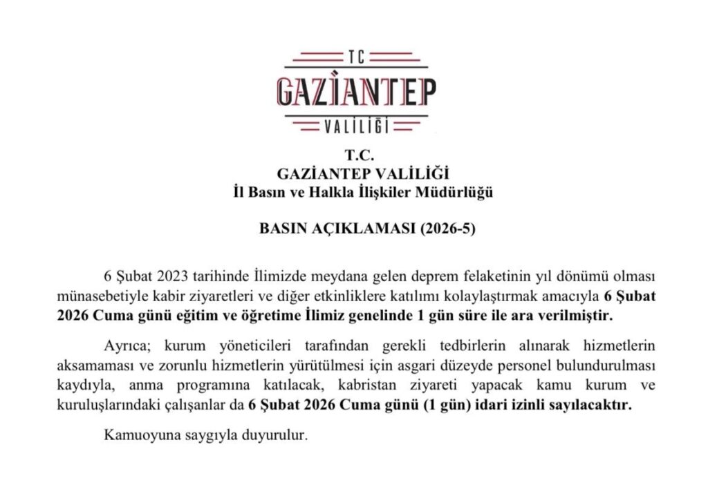 Gaziantep Valiliği, 6 Şubat 2023 depremlerinin yıl dönümü nedeniyle önemli bir karar aldı. Valilikten yapılan yazılı açıklamaya göre, 6 Şubat 2026 Cuma günü Gaziantep genelinde eğitim ve öğretime 1 gün ara verildi.