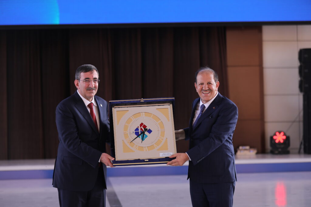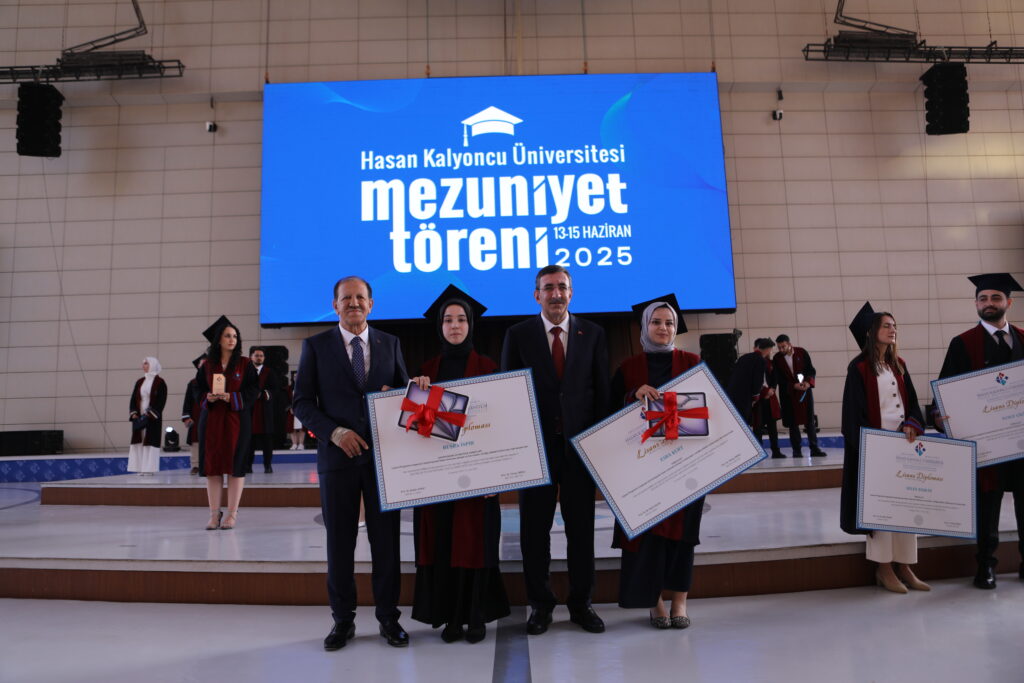 Konuşmaların ardından Hasan Kalyoncu Üniversitesi’nin 2024 – 2025 öğretim yılını dereceyle tamamlayan üniversite birincisi, ikincisi ve üçüncüsüne başarı belgeleri ve ödülleri Cumhurbaşkanı Yardımcısı Cevdet Yılmaz ve Gaziantep Eğitim ve Hizmet Vakfı Başkanı Cemal Kalyoncu tarafından takdim edildi.