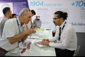 SANKO Holding standını ziyaret eden misafirler, SANKO yetkilileri ile görüşme fırsatı yakalarken, VR gözlüklerle sanal gerçeklik deneyimi de yaşıyor.