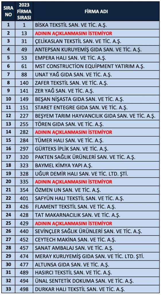 -“İSO 1000 LİSTESİNDE 2023 YILINA GÖRE GAZİANTEP’TEN 62 FİRMA YER ALDI”