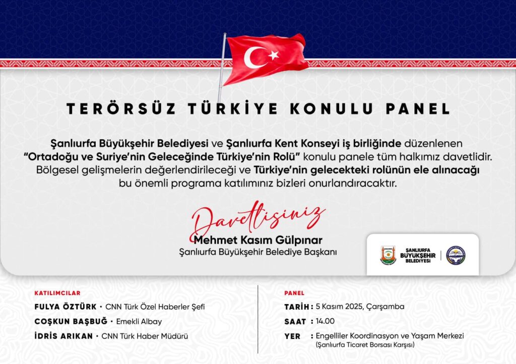 ‘Terörsüz Türkiye’ konulu Panel 5 Kasım 2025 Çarşamba günü saat 14.00’te Engelliler Koordinasyon ve Yaşam Merkezi’nde (Şanlıurfa Ticaret Borsası karşısı) yapılacak.