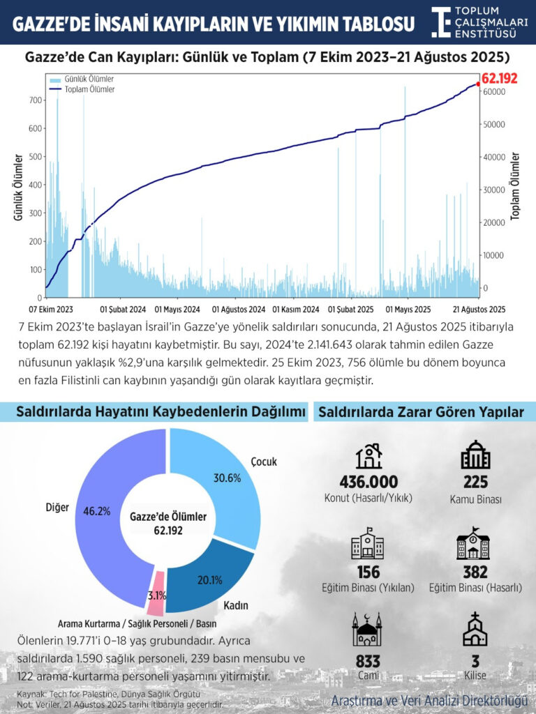 İsrail’in 7 Ekim 2023’te başladığı ve yaklaşık iki senedir süren Gazze Şeridi’ndeki saldırıları, geride acı bir bilanço bıraktı. Toplum Çalışmaları Enstitüsü’nün verilerine göre 7 Ekim 2023’ten 21 Ağustos 2025 tarihine dek geçen sürede toplam 62 bin 192 kişi İsrail’in saldırıları sonucu hayatını kaybetti.İsrail’in 7 Ekim 2023’te başladığı ve yaklaşık iki senedir süren Gazze Şeridi’ndeki saldırıları, geride acı bir bilanço bıraktı. Toplum Çalışmaları Enstitüsü’nün verilerine göre 7 Ekim 2023’ten 21 Ağustos 2025 tarihine dek geçen sürede toplam 62 bin 192 kişi İsrail’in saldırıları sonucu hayatını kaybetti.