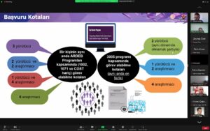 Video konferans yöntemi ile çevrimiçi gerçekleştirilen seminerde, TÜBİTAK-ARDEB Uzmanı Yeliz Omuzlu Aksoy, katılımcılara 3005 programının detayları hakkında bilgi verdi.