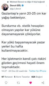 Vali Gül’ün sosyal medya paylaşımı şöyle: “Gaziantep’te yarın 20-25 cm kar yağışı bekleniyor. Sundurma vb. statik yapılar kar yüküne dayanamayarak çöküyorlar. Kar yükü taşıyamacak pazar yerleri bu hafta kullanılmayacaktır.