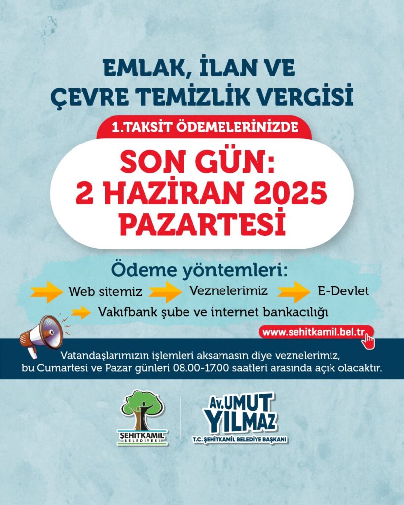 Şehitkamil Belediyesi tarafından yapılan yazılı açıklamada, emlak, ilan ve çevre temizlik vergisi 1. taksit son ödeme tarihinin 02 Haziran Pazartesi olduğu hatırlatıldı. Açıklamada, haftasonu da belediye veznelerinin açık olacağı belirtilerek, “2025 yılı emlak, arsa ve işyerlerine ait emlak vergisi, çevre temizlik vergisi, ilan-reklam vergisinin 1. taksitine dair borçların ödemelerinin 02 Haziran 2025 Pazartesi tarihine kadar yapılması gerekmektedir. Mükelleflerimiz ödemelerini; bu tarihe kadar Şehitkamil Belediyesi vezneleri, sehitkamil.bel.tr adresi üzerinden ya da Vakıfbank şube ve internet bankacılığı üzerinden yapabileceklerdir. Vatandaşlarımızın işlemleri aksamasın diye veznelerimiz bu Cumartesi ve Pazar günleri 09.00 ile 16.00 saatleri arasında açık olacaktır” ifadelerine yer verildi.